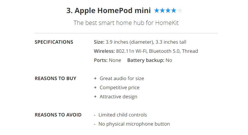We actually think that Apple's HomeKit smart home platform is better than Google's. Even though HomeKit supports fewer devices, it allows for greater complexity when creating smart home routines. And, we don't have to worry as much what Apple is doing with our data.The HomePod mini is not only an affordable smart speaker, but it also acts as a HomeKit hub, letting you connect locks, lights, and other low-power devices directly to it. The HomePod mini also has Thread built in; while there are relatively few smart home gadgets that have this technology, we expect it to increase in popularity, as it's supported by both Apple and Google.
