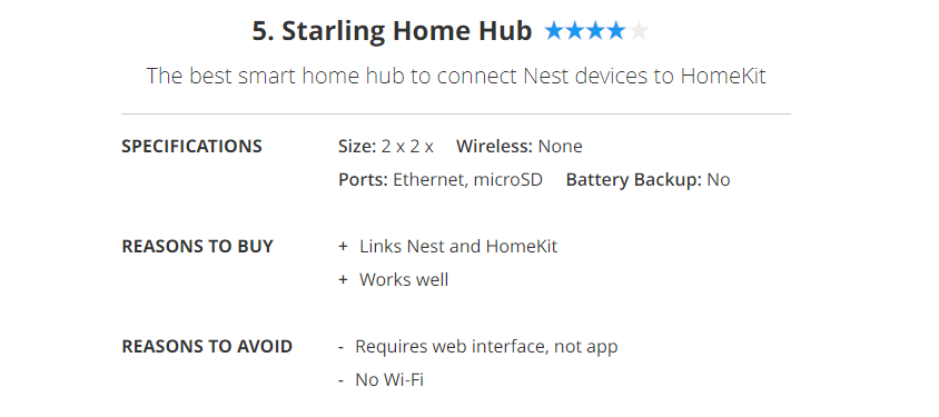 The Starling Home Hub does one thing, and does one thing well: It connects Nest devices — such as the Nest Learning Thermostat and the Nest Protect — to Apple's HomeKit smart home platform. (Sadly, Apple and Nest have never played well together). This means if you're using Apple's smart home platform, you can use some of the best smart thermostats and best smart smoke detectors. Even better — the Starling Hub also lets you view your Nest security cameras in the Apple Home app, though you'll need to use the Nest app if you want to see any saved videos. A recent update added support for the new Nest Doorbell (battery) and the new Nest Cam (battery).